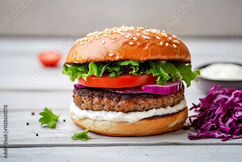 A chicken burger with red cabbage, tomato, and mayonnaise on the side, served on a light grey wooden table. Studio shot, low angle, side view, food