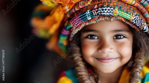 A child beams with joy while wearing vibrant traditional attire outdoors, capturing a moment of innocence and cultural expression in the bright sunlight.