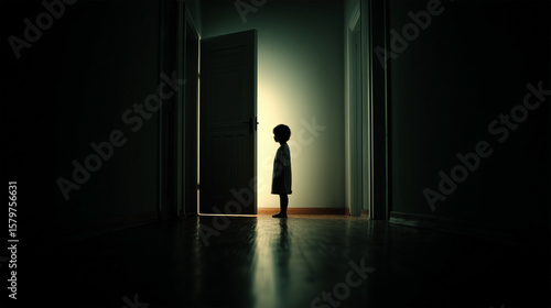 A child is standing in a dark room with a door open