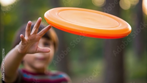 A child reaching for a flying frisbee in a natural outdoor setting, capturing a moment of playfulness and joy.