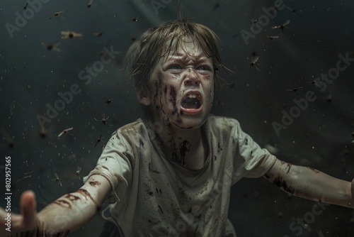 A child with blood all over their face. Suitable for horror or Halloween themes