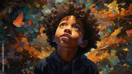 a child with curly black hair in the style of afro looks up admiringly from where the lighting is coming, autumn colorful background behind