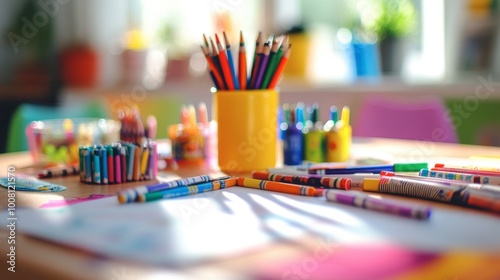 A children's art table, covered with paper, crayons, and colorful markers, ready for creative play.