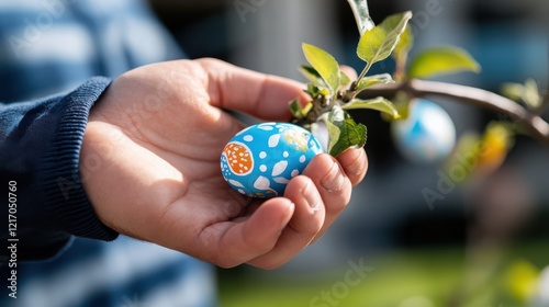 A child's hand delicately holds a beautifully painted Easter egg among branches, embodying the innocence and joy of childhood during festive springtime traditions.
