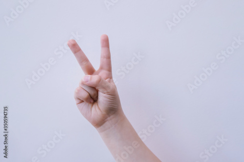 A child's hand shows a victory gesture on a white background. Two fingers up.