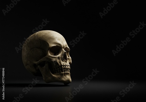 A chilling and ancient skeletal head emerges from a dark, foreboding background, conveying a sense of terror and the unknown ,textured ,danger ,terrifying