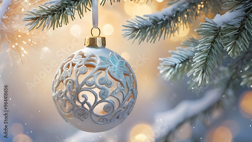 A Christmas ornament with intricate patterns hanging from a snow-dusted pine branch, surrounded by glowing bokeh and twinkling fairy lights