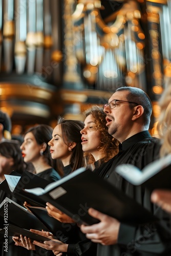 A church choir singing with passion, choir robes and musical sheets, grand church interior with organ pipes in the background. Music, faith, and the joy of worship, banner with copyspace for text.