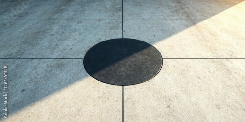 A circular dark inset on a light gray paved surface, bisected by shadows from overhead sunlight