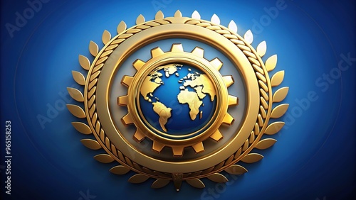 A circular icon featuring a stylized gear and globe, symbolizing international fellowship and service, set against a bright blue background with golden accents.