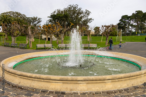 a circular water fountain in the center of the courtyard at Golden Gate Park with people walk and green trees, plants and grass in San Francisco California USA