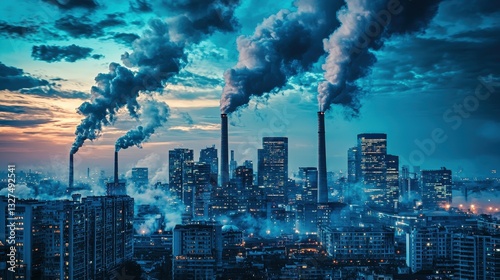 A city skyline at dusk, with industrial smokestacks emitting dark smoke into the atmosphere, highlighting urban pollution and environmental concerns.