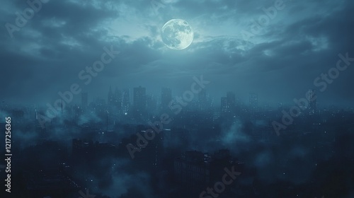 A city skyline under a full moon surrounded by stars, symbolizing calm and beauty. Perfect for travel, cityscapes, and night photography.