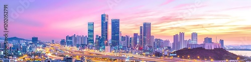 A city skyline with a purple sky in the background