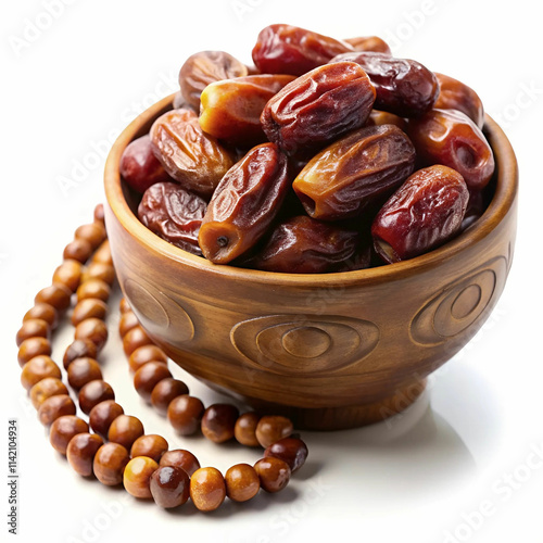 A classic Arabic bowl filled with dates, accompanied by an Islamic rosary,
