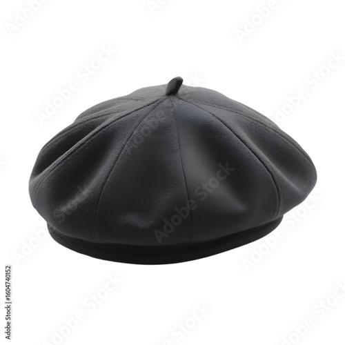 A classic black beret hat, a timeless fashion accessory, isolated on a transparent background