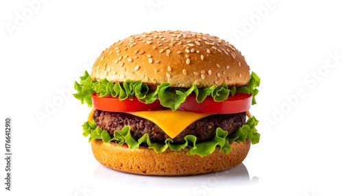 A classic burger with sesame seed bun and colorful toppings