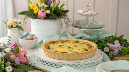 A classic Easter brunch featuring a golden, cheesy quiche on a cake stand, surrounded by floral arrangements and festive tableware. A perfect centerpiece for a joyful springtime gathering.