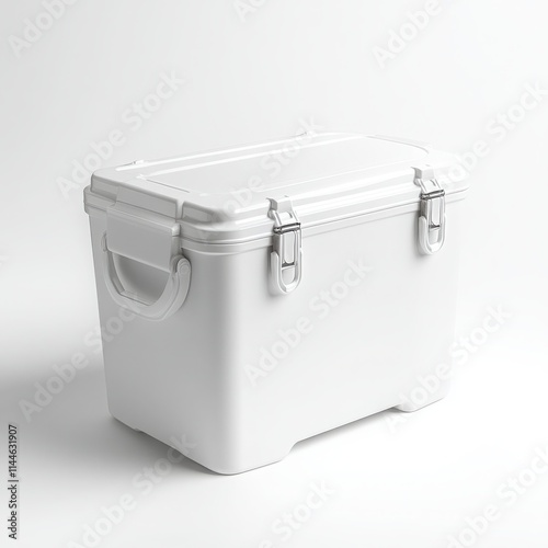 A classic plastic cooler with a sturdy handle, side latches, and a white exterior on a white background