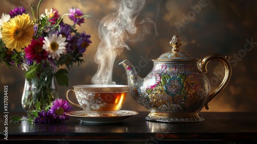A classic porcelain teapot and a matching teacup filled with steaming tea, sitting on a rustic wooden table. Beside them, a charming flower vase with a small bouquet of fresh flowers