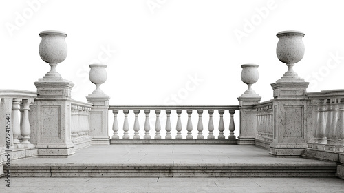 A classic stone balustrade with decorative urns and steps, showcasing architectural elegance and classical design elements in monochrome.