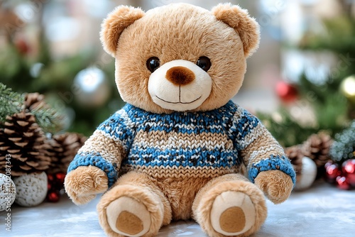 A classic teddy bear wearing a knitted sweater, centrally placed on a spotless white background. The toy is photographed with sharp focus, showcasing the soft texture of the fur and the intricate