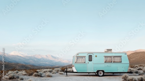 A classic turquoise trailer rests in the middle of a barren desert scene with rugged mountains in the background, symbolizing solitude and journey, elegantly captured.