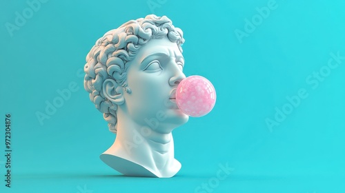 A classic white marble bust of a young man, blowing pink bubble gum against a vibrant turquoise background.