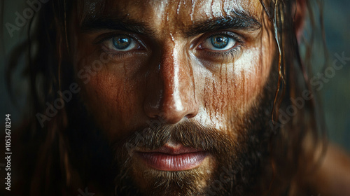 A classical painting of Jesus Christ in the Renaissance style, with soft, realistic features and dramatic light shining on His face