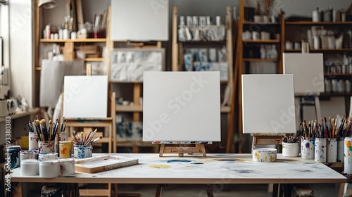 A clean craft workshop with art supplies, paints, and blank canvases