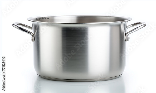 A clean, high-resolution studio shot of a shiny stainless steel stockpot or saucepot with two handles, isolated on a white background.