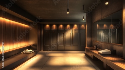 A clean locker room in a modern fitness center with sleek design and subtle lighting. digital
