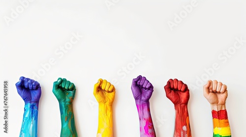 A clean, minimalist design featuring a series of hands raised up, each painted in the colors of different Pride flags, against a pure white background. Generative AI
