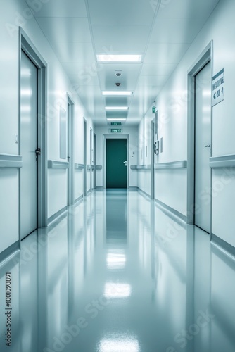 A clean, modern hospital corridor with bright lighting and reflective floors.
