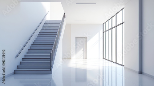 A clean, white, modern interior of an office building with a staircase, door, and window