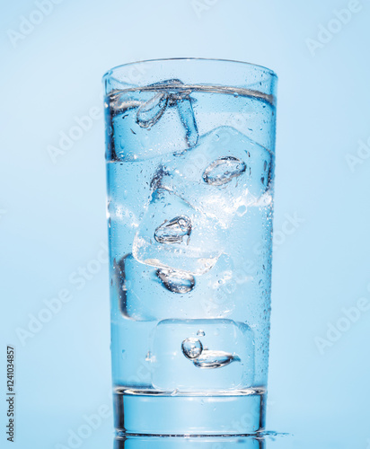 A clear glass filled with chilled water and ice cubes, creating a refreshing and cool drink