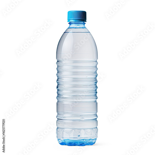 A clear plastic water bottle with a blue cap and a blue liquid inside, isolated on a transparent background