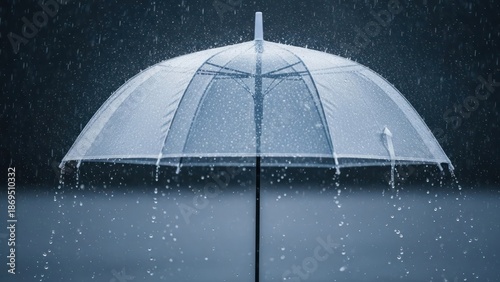A clear umbrella shields against a downpour, with raindrops cascading down