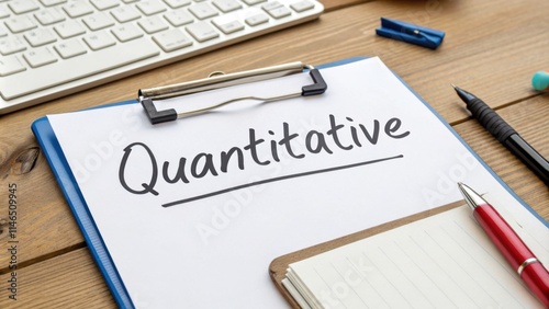 A clipboard with the word "Quantitative" written on it, surrounded by office supplies.