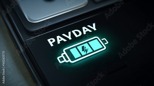 A close up of a black keyboard button with the word payday and a battery icon illuminated in blue