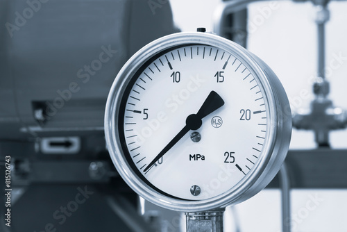 A close up of a pressure gauge on a machine, industrial concept