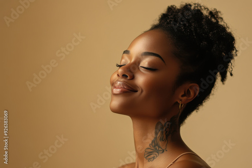 A close up of a tattooed black woman's face with her eyes closed