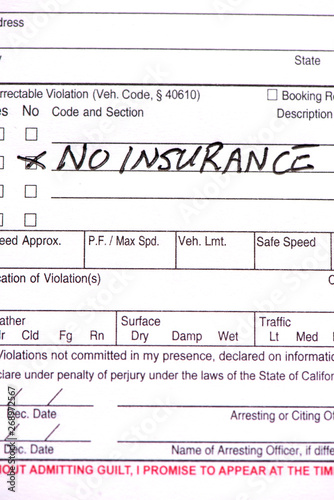 A close up of a traffic ticket with the words "No Insurance" written on it.