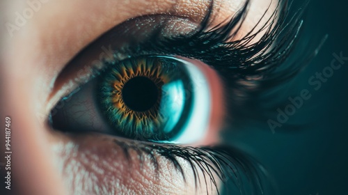 A close up of an eye with thick eyelashes
