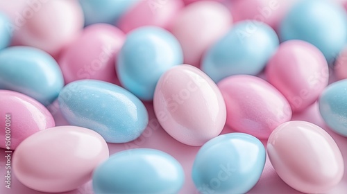 A close up of many pastel colored candy coated almonds in shades of pink and light blue filling the frame