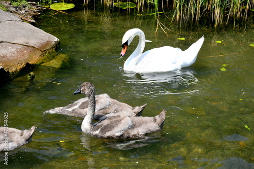 A close up on several grey ducks and a single white swan with an orange beak swimming in a shallow pond or river with its bottom visible and covered in rocks seen on a sunny summer day in Poland