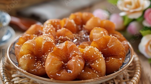 A close up shot of a bowl of lokma with sesame seeds on a woven mat with flowers in the background