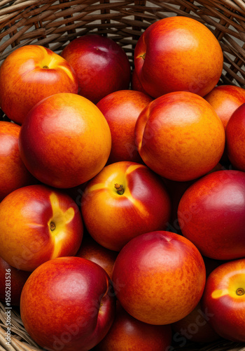 A close up shot of a full wicker basket brimming with ripe, colorful nectarines.