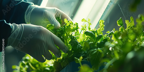 A close up shot of hands in white gloves picking green lettuce from an indoor hydroponic plant, generative AI