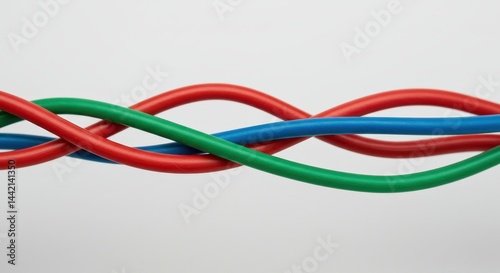 A close up shot of intertwined red green and blue wires on a plain white background in a studio setting